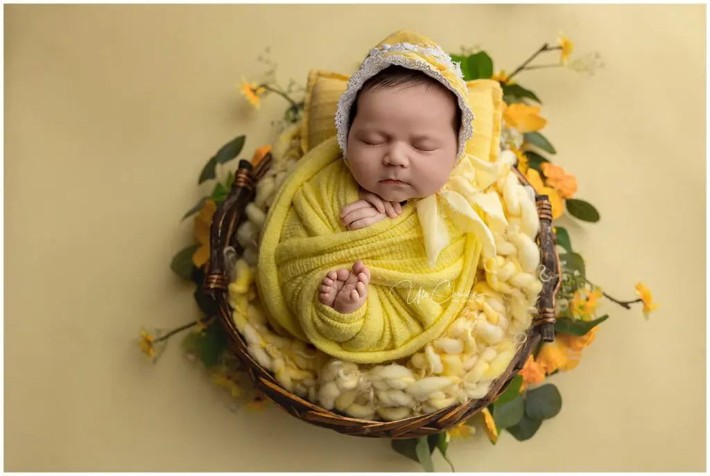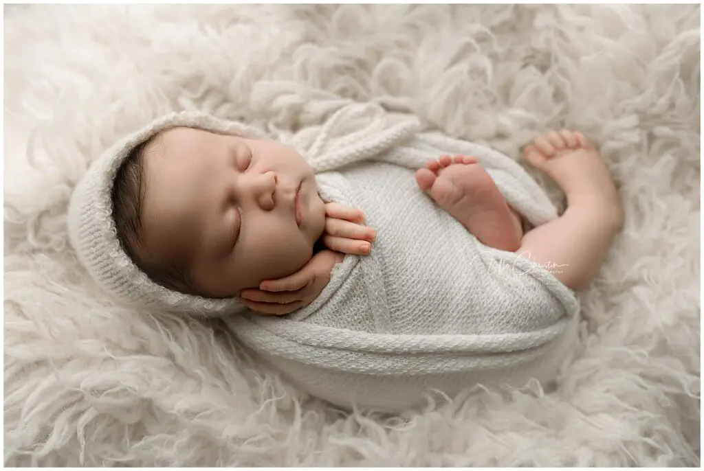 Newborn photography magic happens when your baby is between 8 and 14 days old. Why? Because babies are sleepiest, curl up best, and are more flexible during this golden window.