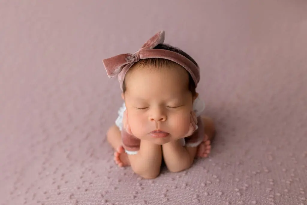 Most photographers offering luxury newborn portraits offer a deluxe newborn session which can take up to three hours. This extra time allows for the baby to be changed into several outfits and lie in numerous poses. Difficult poses, such as Froggy & Taco, are only offered during the deluxe session as they can take up to 20 minutes to achieve. During the deluxe session your baby will also be placed into props as well as lay cozy on a flokati.