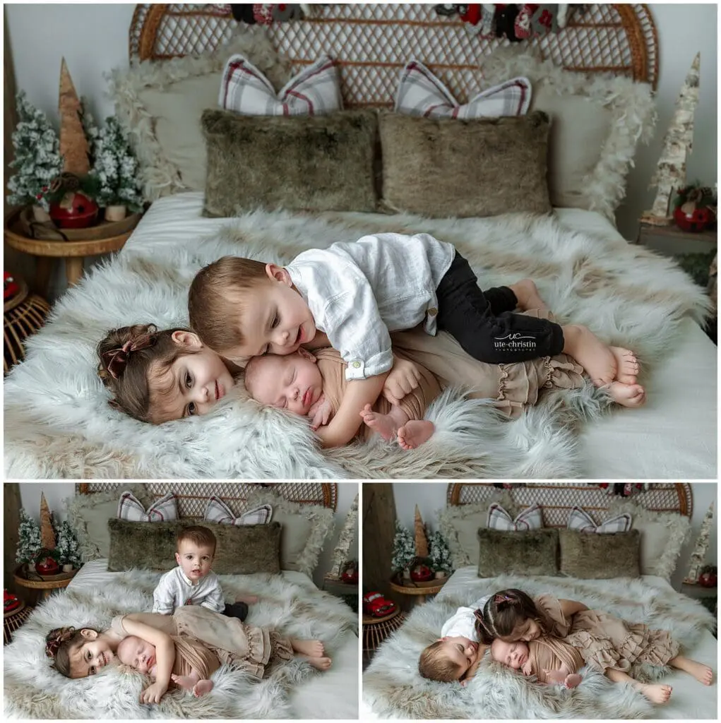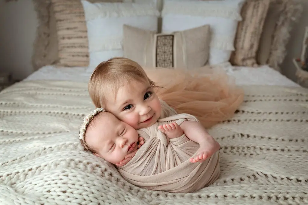 The big day is here! Trust that your photographer will come up with creative ways to feature the siblings together. The photographer may place the toddler’s hand in the newborn’s hand, or have the toddler give the newborn a gentle kiss on the cheek. These shots show the love and bond between the two siblings. Allowing the children to interact naturally and playfully will give you some wonderfully authentic photos.